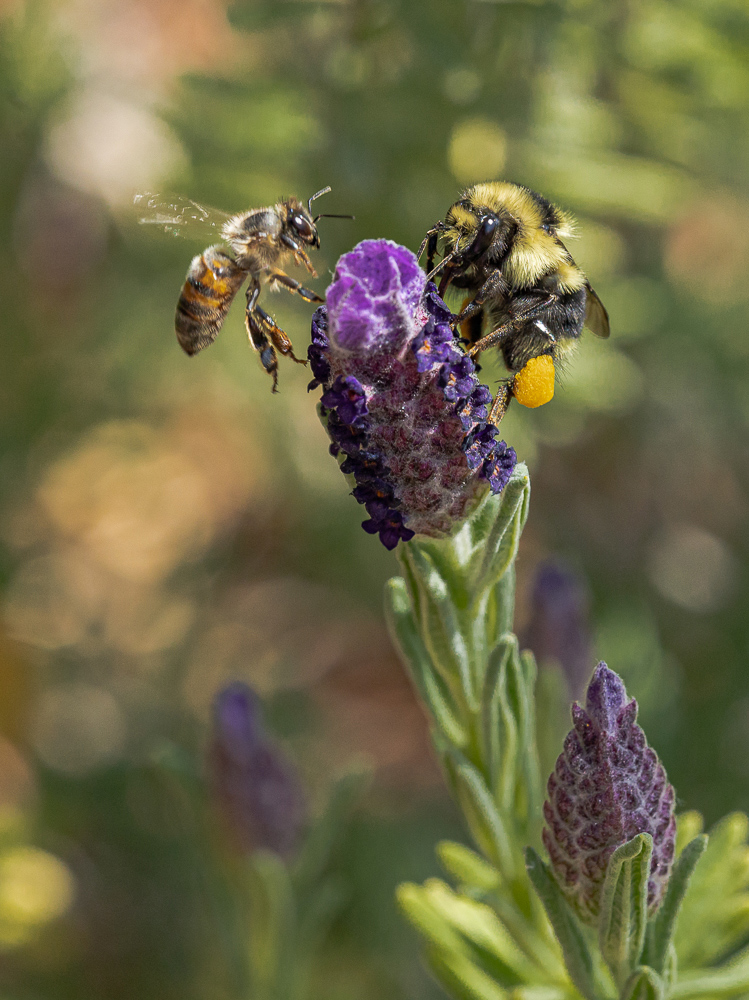 I took a few shots to get my timing back. Then, out of the corner of my left eye, I saw a Honey Bee headed toward the same bloom that my Bumble Bee was on, but didn’t see it on the other side until just before it was about to land. I shot this image at the critical moment at which the Honey Bee reversed course and “hightailed it out of Dodge”.