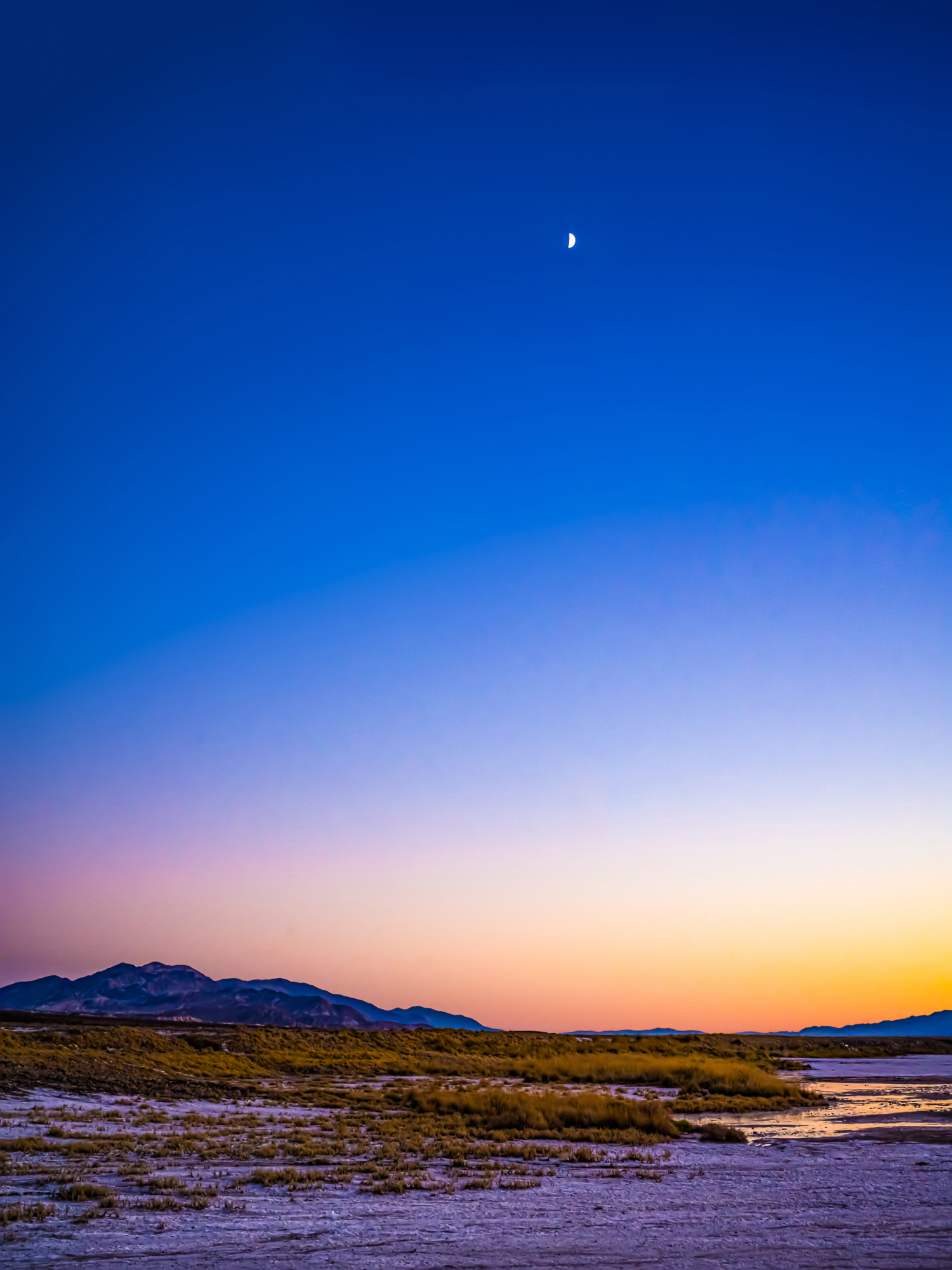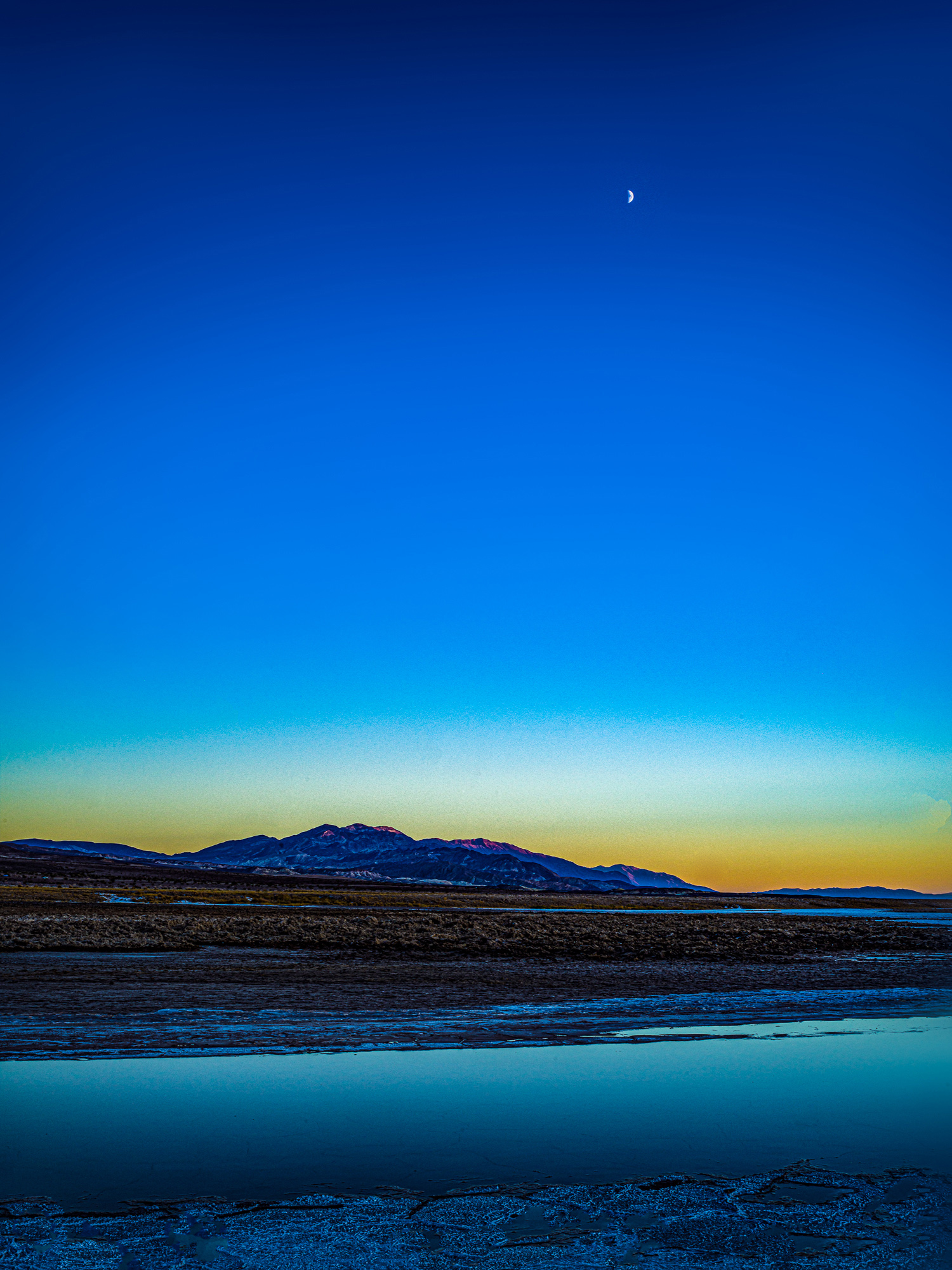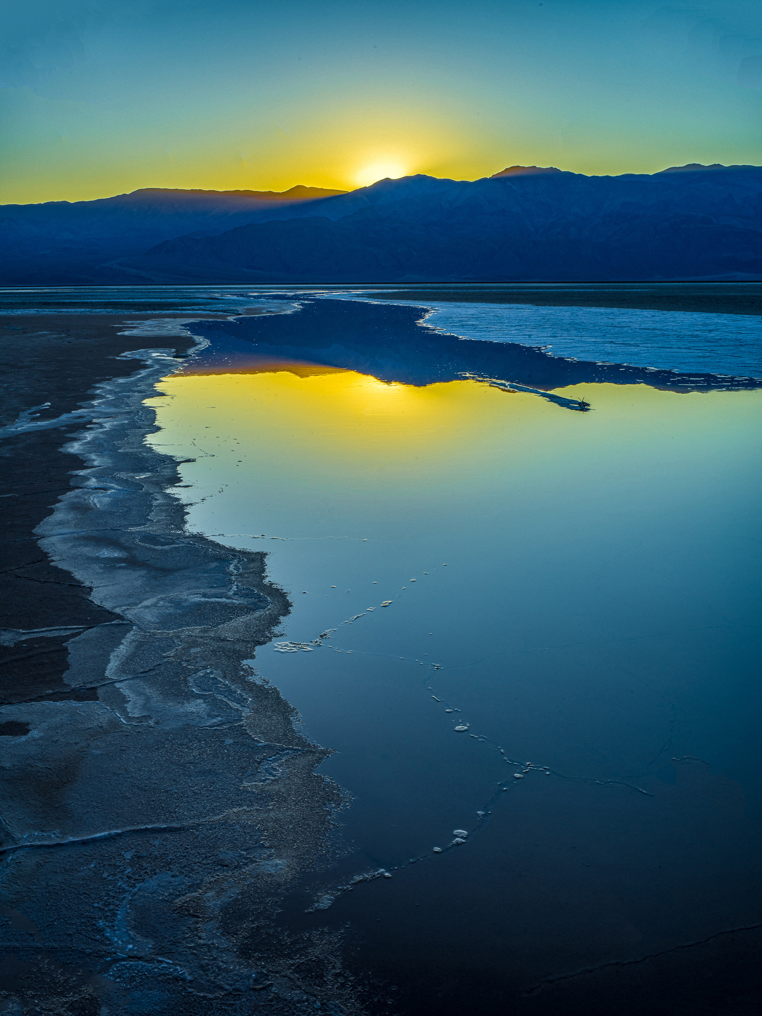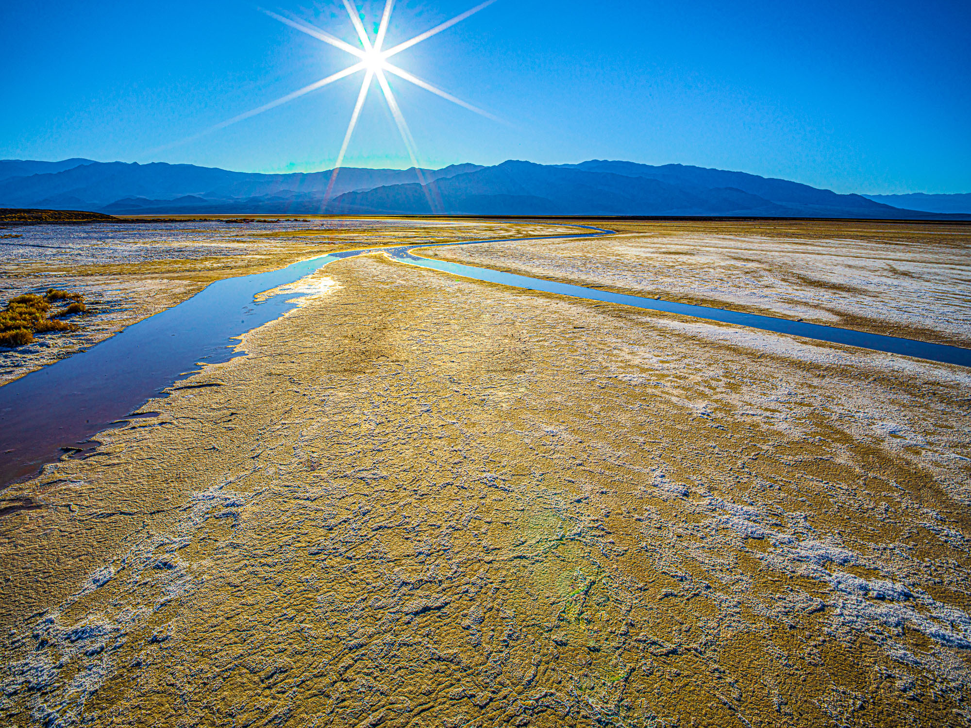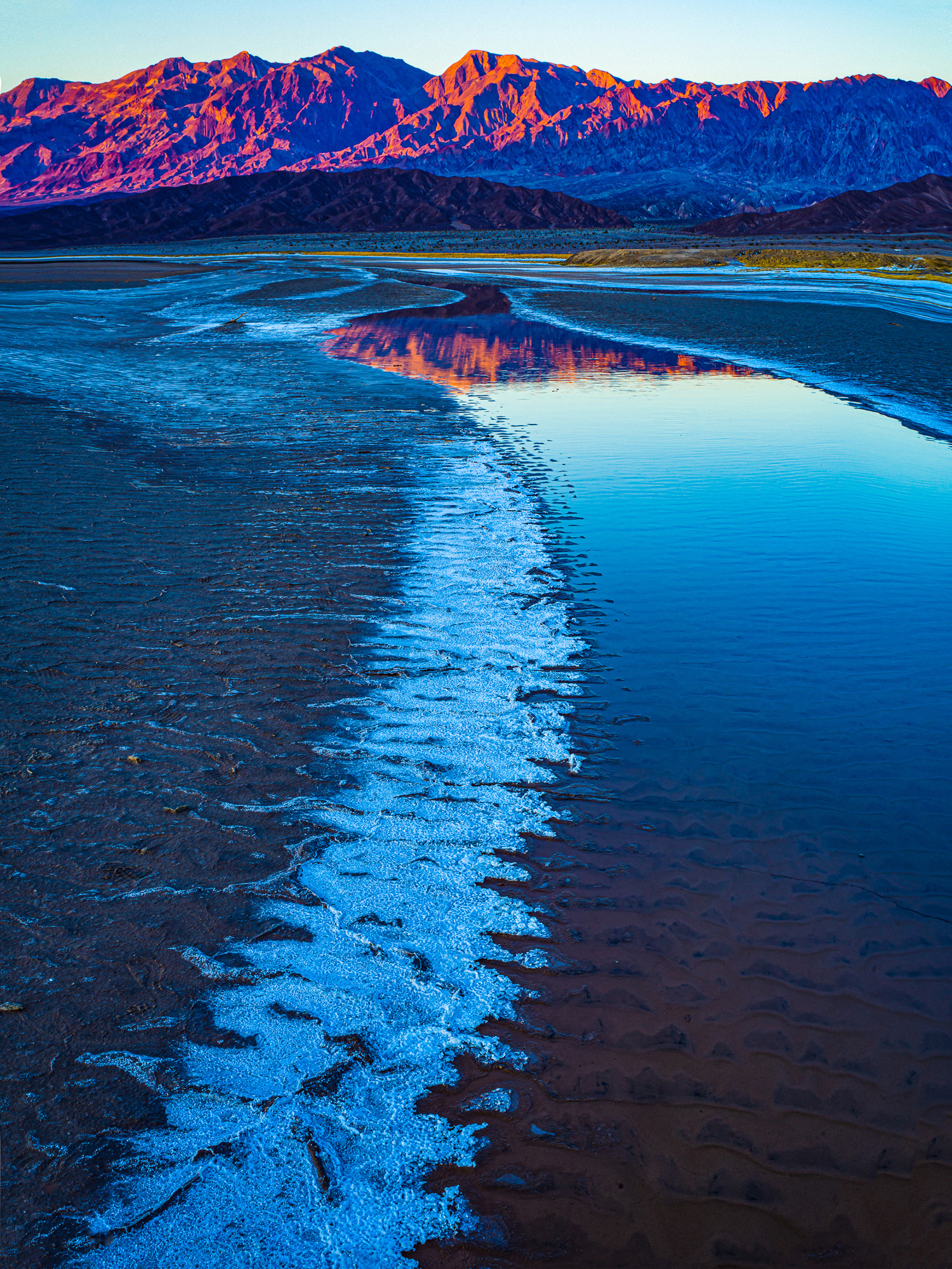 I was drawn into the playa by the curiosity of what lay beyond the next turn in the stream. As I wandered, the sun began to slowly set in the west, and the stream began to reflect the heavens.