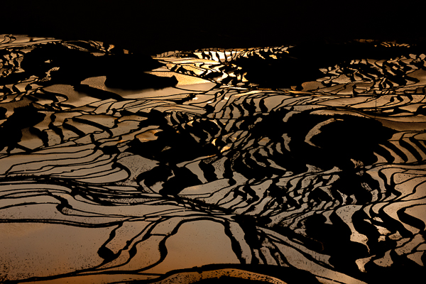 I have been out of touch with the world for 4 days now, mostly due lack of TV and internet, but the shooting has been some of the best of my life. Two nights ago I was photographing the rice terraces near the town of Yuang Yang. These terraces create some of the most unique, linear, abstract landscapes I have ever visited. I not only use a situation like this to create the overall traditional landscape image, but also, zoom in to utilize the amazing series of lines that are available to me.