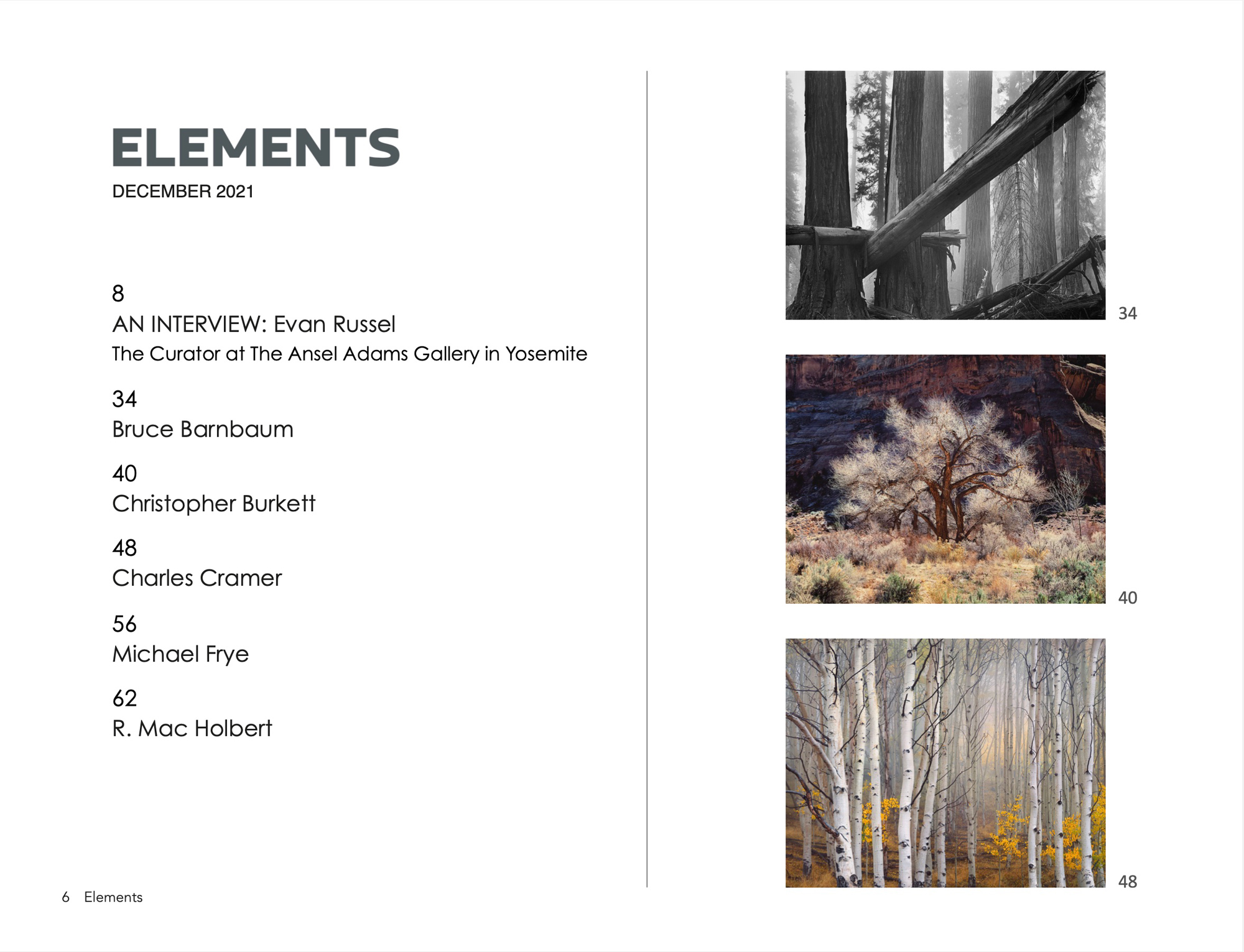 As someone who has shot and studied landscape photography for over 30 years, I felt that the sophisticated landscape photography you find in galleries or photographic books is not featured widely enough. One reason is that many photographers who shoot this type of work focus on prints and long-term projects rather than social media. Christopher Burkett, Charles Cramer, or Paul Wakefield, all iconic photographers and trailblazers of landscape photography, are absent or fleeting on social media. For better or worse, social media is where most landscape photography is presented and viewed – especially by the new generation of photographers. We wanted the ELEMENTS Magazine to become a showcase for this superb, ground-breaking work.