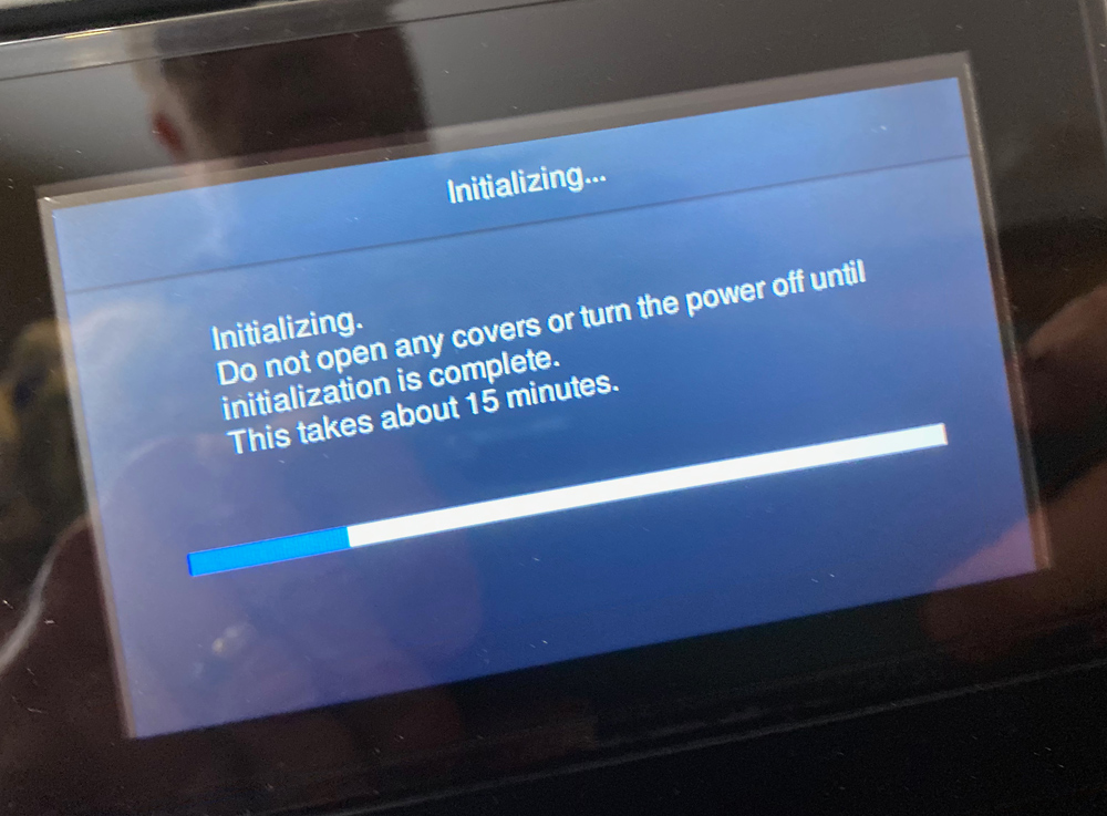 During this time the printer will make all sorts of crazy noises as it pumps ink to the print head and preps itself. This is a one time deal so go grab a cup of coffee. There is a countdown timer on the control panel that lets you know when to expect the process to be complete. Trust me, it seems to take a lot longer if you sit there and watch the process and count time backward.