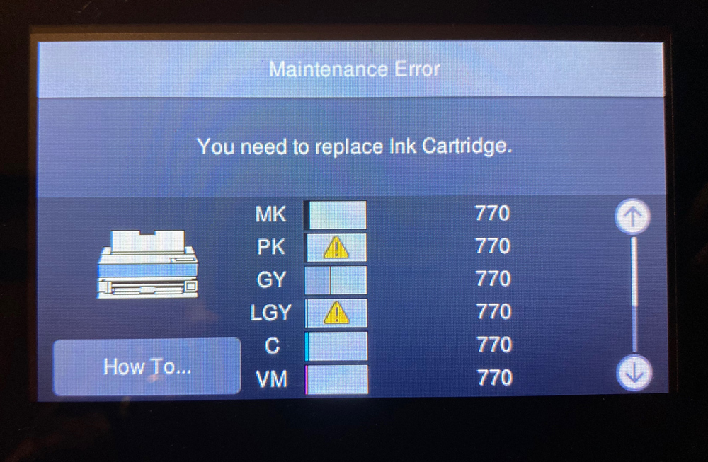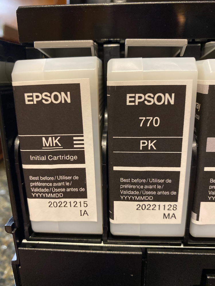 I was a bit surprised and it wasn’t mentioned anywhere that the starter cartridges for the printer are not the full-size 25ml cartridges that you purchase. You can see by the image below that the levels of ink are not that high once the charging of the printer was completed. I highly recommend when purchasing this printer that you order an extra set of inks. I made around 15 prints before I got a low ink warning. That was kind of a shock to me. I would also recommend you purchase a maintenance tank as a spare. There is nothing worse than having all the ink you need but find out you can’t print anymore because you don’t have a spare maintenance tank. Always have one of those on hand.