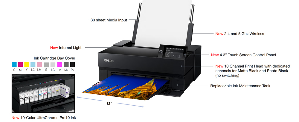 Epson claims there is a 6% wider color gamut than previous printers. This doesn’t sound like much but I do feel the images I have printed have a bit more color in the fringe areas. It’s hard to describe and measure but the images certainly look good on all print surfaces. There is now a violet ink channel that helps improve blues, violets, and purple. The way these inks work is a mystery and magic to me. For example, Canon printers use a different ink set but if I print the same file on each printer it would be nearly impossible to tell them apart.