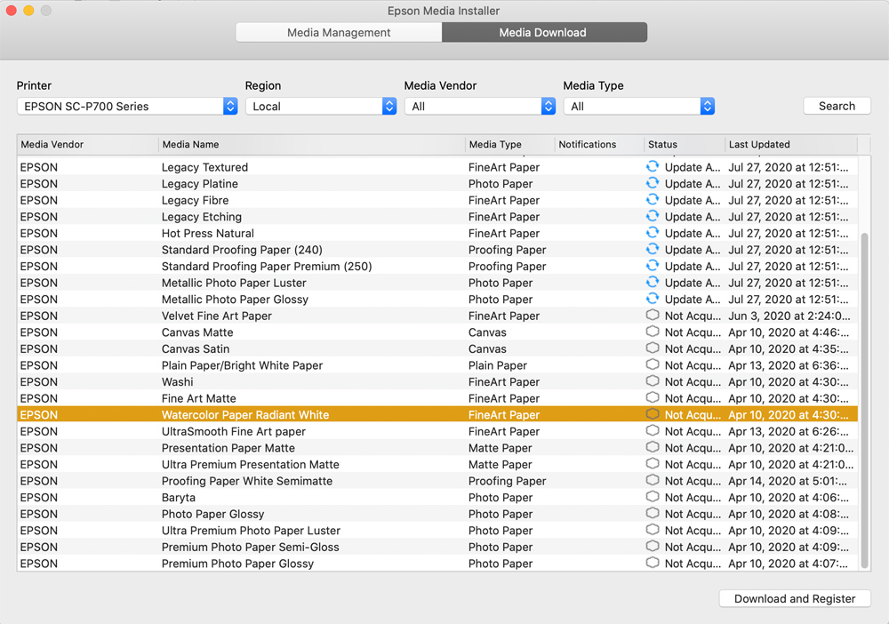 The printer has a number of media profiles built-in as well as the Epson Print Layout software and apps. If you use any of the Epson papers then you don’t need to do anything but select the paper you are using. However, if you use a different paper type and surface you are going to have to add it to the software.