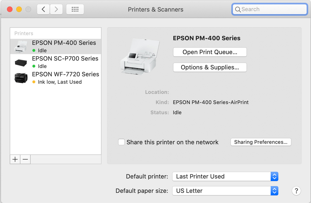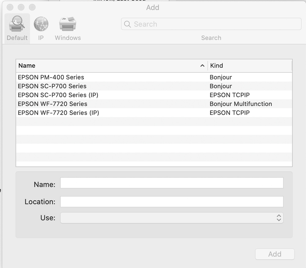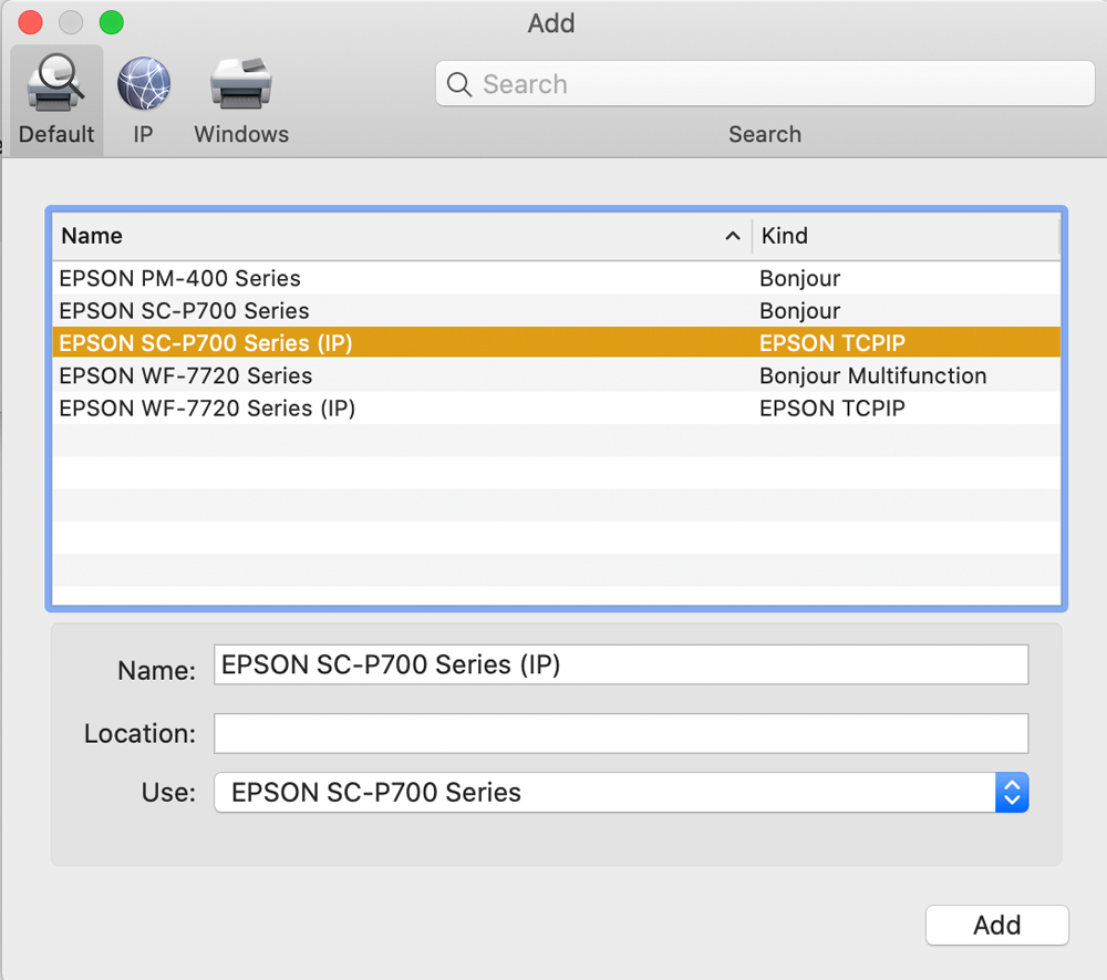 You’ll get a window that opens showing any printers previously installed. You click the plus button on the list of printers and you’ll get another window, simply titled “add.” You should then see a list of available printers that are connected to your network. Select the Epson P700 Bonjour and click add.