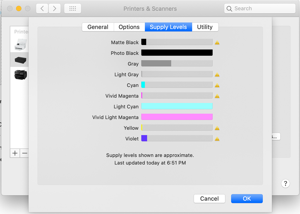It will now be available as an installed printer. If properly installed and connected, you can customize a few things to your taste if needed. I just left it at its default as shown. You can check the ink levels right on your computer. The utility selection shown belows allows for opening the print utility, print a test page, or clean print heads.