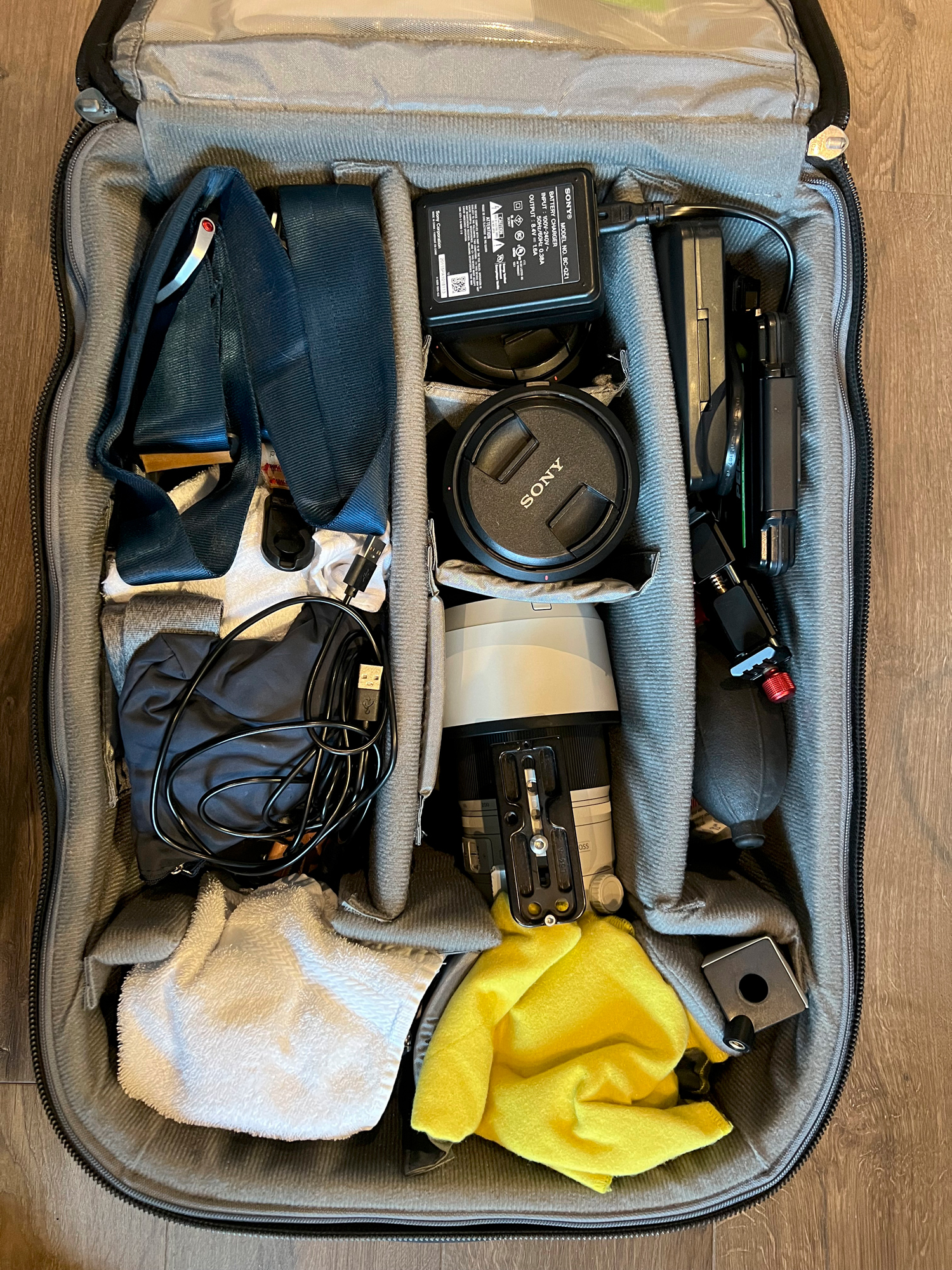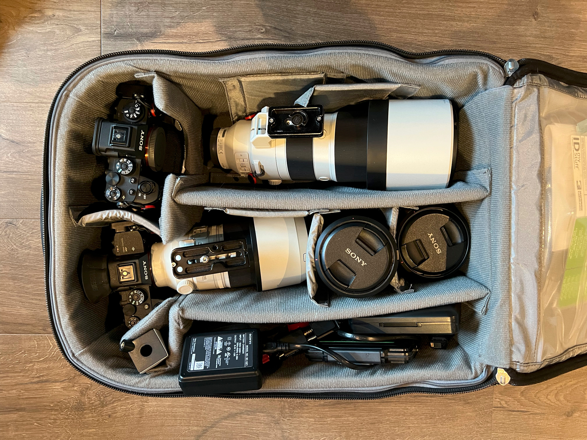 Inside the ThinkTank, roller bag is a Sony a1 and a7r iv. These are my favorite cameras of all time. The a1 for nature photography is an incredible workhorse. Super fast focus, animal eye lock-on, and a very fast shutter frame rate. This is perfect when shooting Arctic foxes, birds in flight, and polar bears. The a7riv is also good at that, but there mainly for the landscapes I will shoot.