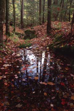 This photo was taken in New Hampshire in fall. I used a Canon Elan IIE with a Canon 20-35 USM lens at F 16. I used a Tiffen warm polarizer to cut the reflections in the pond and do give warmth to this overcast seen. A Bogen 3021 tripod was used to steady the camera