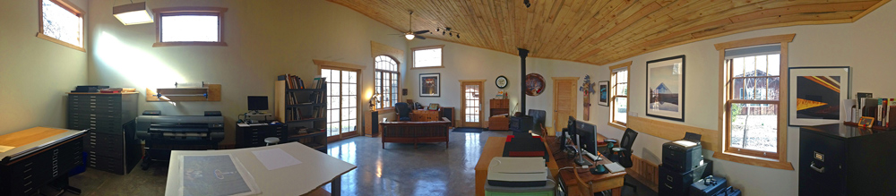 Carl is a self-described workaholic. In addition to running his gallery business and producing fine art digital prints for his shows and other artists, Carl also had to mow the pasture, cut firewood, travel to photograph, and go to shows–always busy as a beaver. But even a prolific fellow like Carl has to slow down sometimes. He decided to sell the farm and “retire” to a smaller homestead just outside River Falls, WI. In 2015 he bought a nice house with less land (and less grass to mow–I think he said something about hiring somebody to do it now). But Carl, being both practical (read cheap) and handy with tools decided to add a studio building on his property. I think he bought the plans on the internet, but aside from the job of finishing the cement floor. He built his studio with his own two hands and that of a few helpers.
