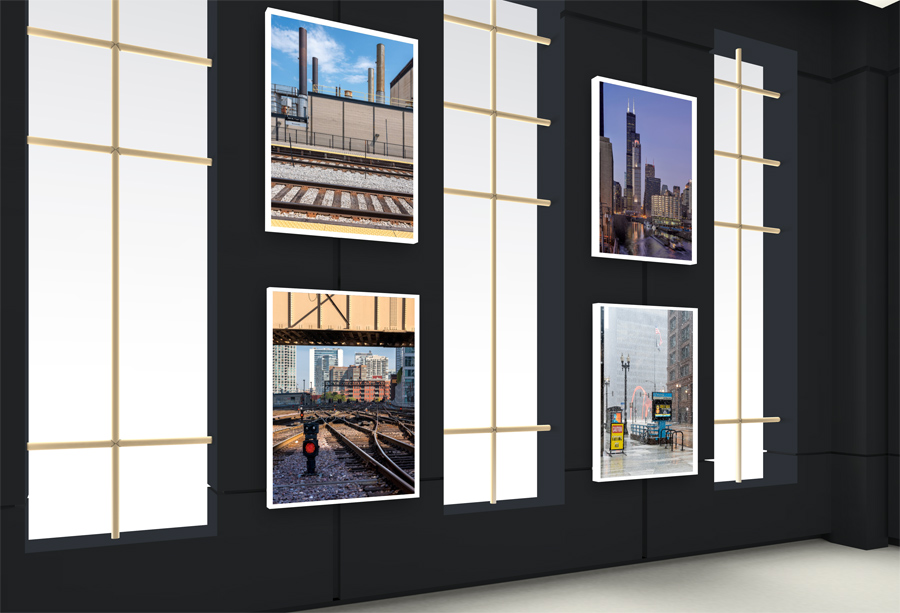 I have a strong preference for the stand-alone rooms because three of the options have windows, which simulate outside light streaming into the gallery space, creating an airy feel. The rooms that can be combined allow for larger exhibits, but none include windows. For each of my three exhibits, I chose the stand-alone gallery with 45 wall positions, plus two on the floor (no clutch).