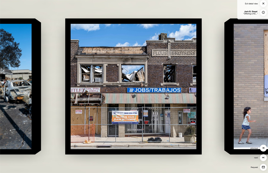 I had stumbled into a project. I made four more trips to Kenosha over the next three weeks, focusing more on the community than on the damage. As the project progressed, I made 140 prints (8.5 by 11 inches) from the hundreds of images I had captured. Doing that gave me ideas for additional images to seek out during subsequent trips. Over that three-week period, I spent time not only sequencing images, but also reading about Kenosha’s history, demographics, culture, and business environment.
