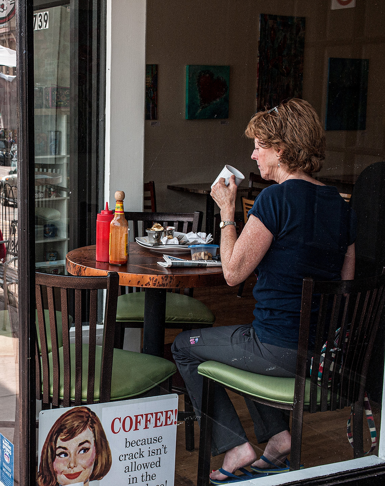 Another effective subject in street photography is an unusual match or mismatch between subject and environment. Here’s an example of my own. I very much doubt the lady is even remotely interested in crack, but the fact she’s drinking coffee connects her directly with the sign.