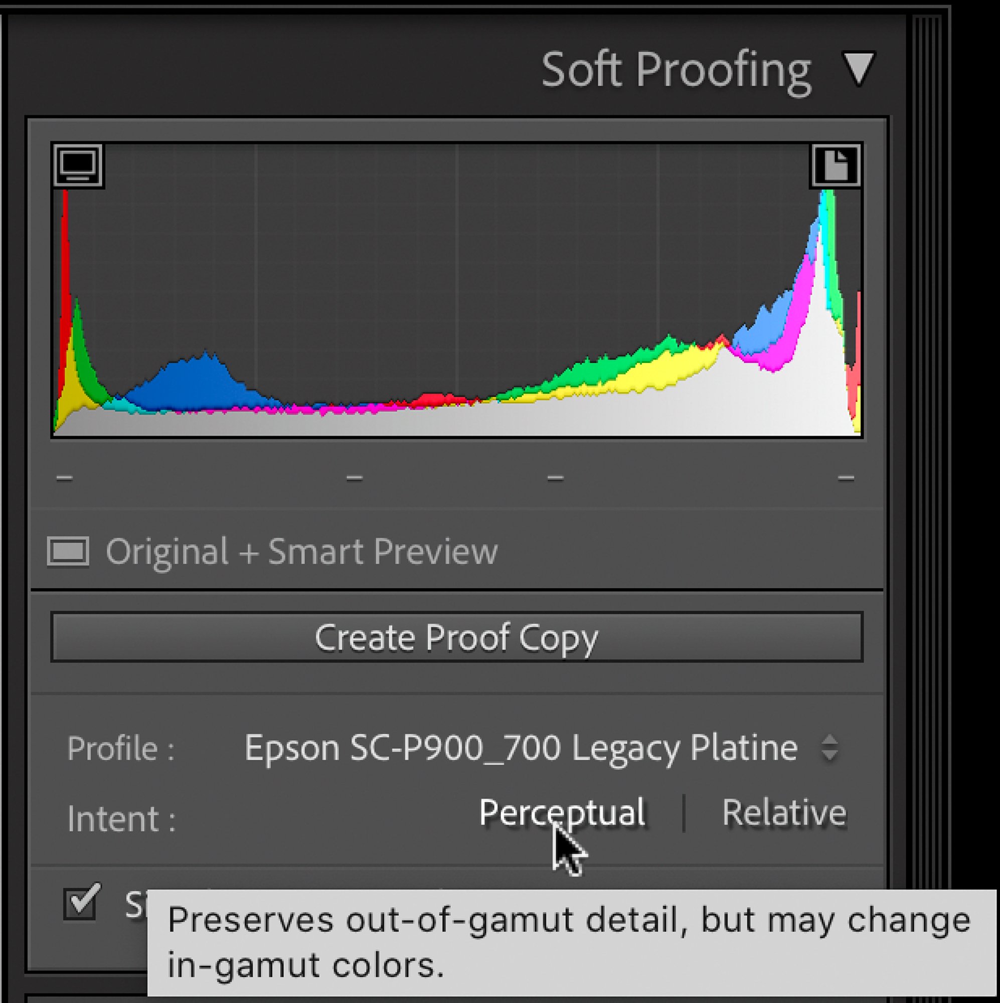 The most important decision to make when soft proofing (once you’ve chosen the paper) is to decide which rendering intent will produce the optimal results for the image. Realize, this is entirely image and paper-dependent and it’s far more efficient than wasting ink and paper printing just to see.