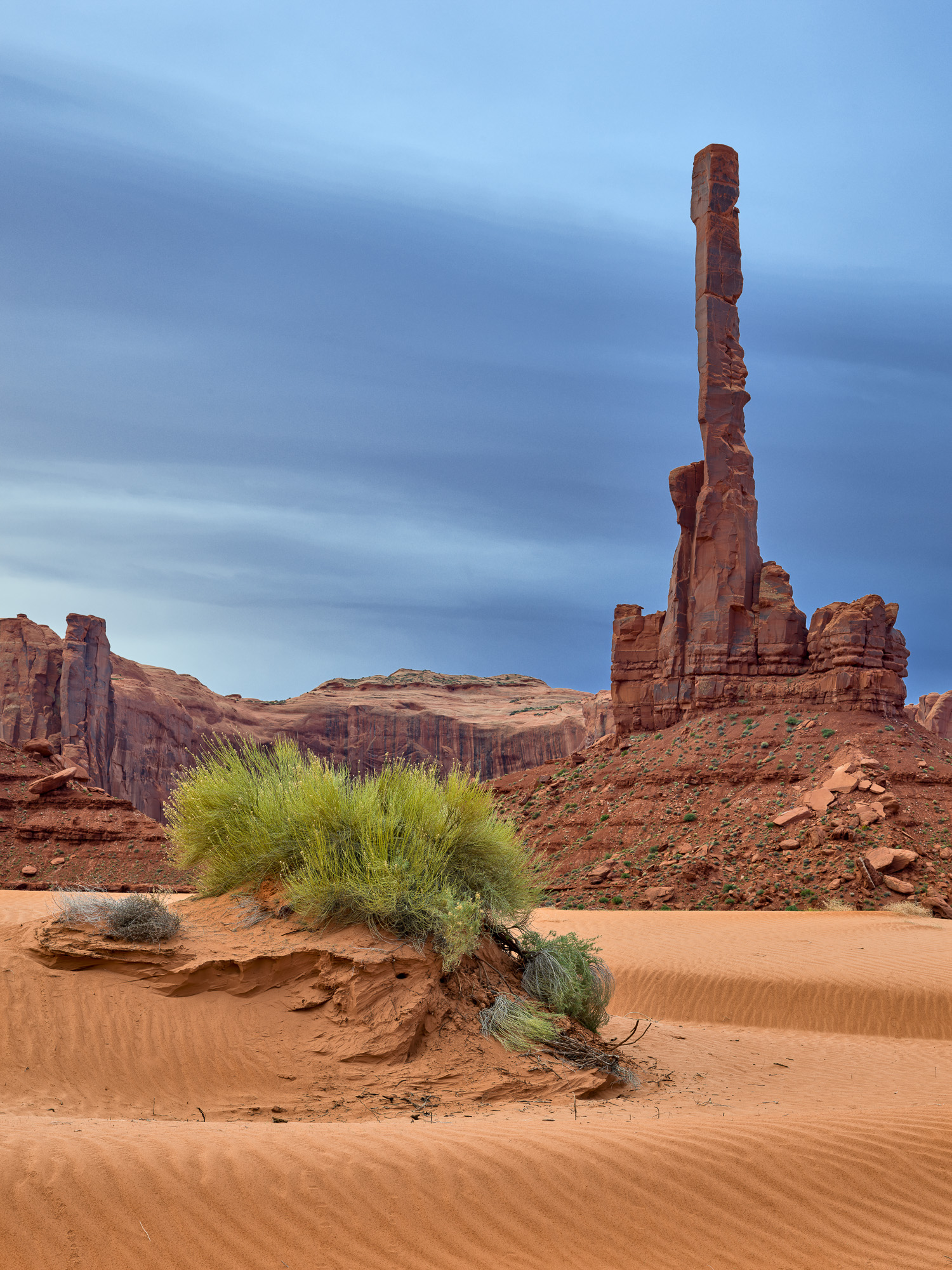 In general, the less tilt you can get away with the better because the DoF wedge will be wider and it will be easier to get everything in focus. That means starting the wedge underground at an acute angle. Below is a great example with the Rodenstock f/5.6 90mm HR-SW; if the depth of field wedge was too narrow, the top of The Totem Pole could have been soft and the bottom sharp (or vice versa), even though those two points in the scene are the same distance from the camera.