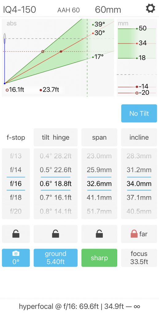 Now the gloves will come off. I have a somewhat “unique” way of explaining tilt. If you bear with me, I will hopefully shed some light on the Black Hole of Tilt. I start by going after some false concepts that are hard to let go. First, I suggest a simple experiment for anyone trying to learn tilt: Find a very flat level place like a parking lot, long hallway or big yard of grass. Set up your tripod 5 feet off the ground and mount the camera perpendicular to the ground. Set your lens focus to infinity. Turn on live view and begin to dial in tilt. Continue until the ground magically comes into focus. it doesn’t matter where you look on the ground because as you slowly dial in more tilt, all the ground in your scene will come into focus at the same time! For a 30mm lens this will occur at about 1 degree of tilt, 60mm 2 degrees, 90mm 3 degrees. Is this not what you expected? It certainly wasn’t what I expected when I first did this. I like this experiment because it destroys the idea most of us have with tilt as beginners: As you dial in more tilt, the plane of focus “lays down.” That’s not really true, and as you just found out it is certainly not true when the lens is focused at infinity. There is a lot to unpack here. I use the Snapi app to illustrate what is going on.