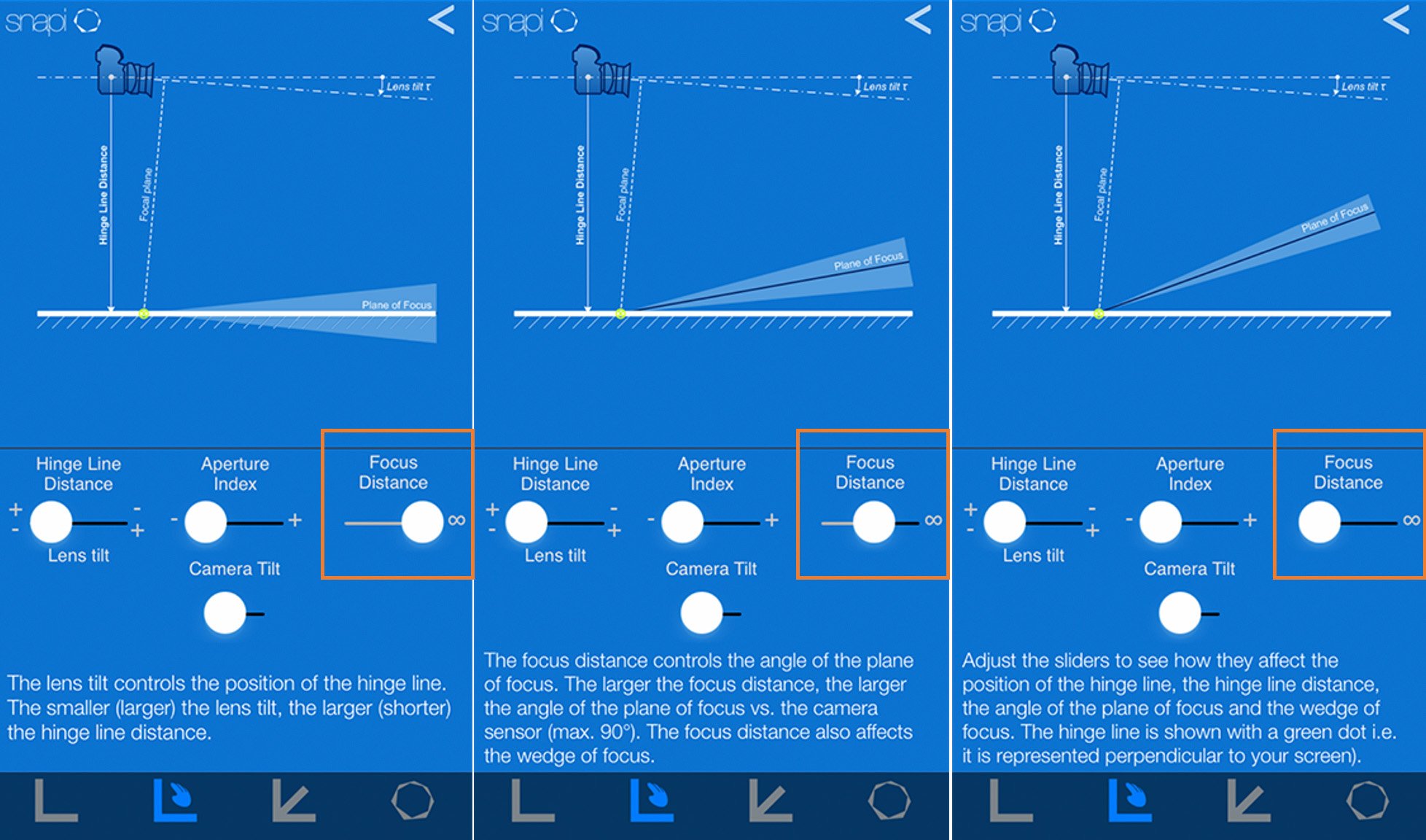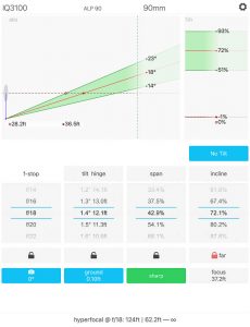 Now the gloves will come off. I have a somewhat “unique” way of explaining tilt. If you bear with me, I will hopefully shed some light on the Black Hole of Tilt. I start by going after some false concepts that are hard to let go. First, I suggest a simple experiment for anyone trying to learn tilt: Find a very flat level place like a parking lot, long hallway or big yard of grass. Set up your tripod 5 feet off the ground and mount the camera perpendicular to the ground. Set your lens focus to infinity. Turn on live view and begin to dial in tilt. Continue until the ground magically comes into focus. it doesn’t matter where you look on the ground because as you slowly dial in more tilt, all the ground in your scene will come into focus at the same time! For a 30mm lens this will occur at about 1 degree of tilt, 60mm 2 degrees, 90mm 3 degrees. Is this not what you expected? It certainly wasn’t what I expected when I first did this. I like this experiment because it destroys the idea most of us have with tilt as beginners: As you dial in more tilt, the plane of focus “lays down.” That’s not really true, and as you just found out it is certainly not true when the lens is focused at infinity. There is a lot to unpack here. I use the Snapi app to illustrate what is going on.