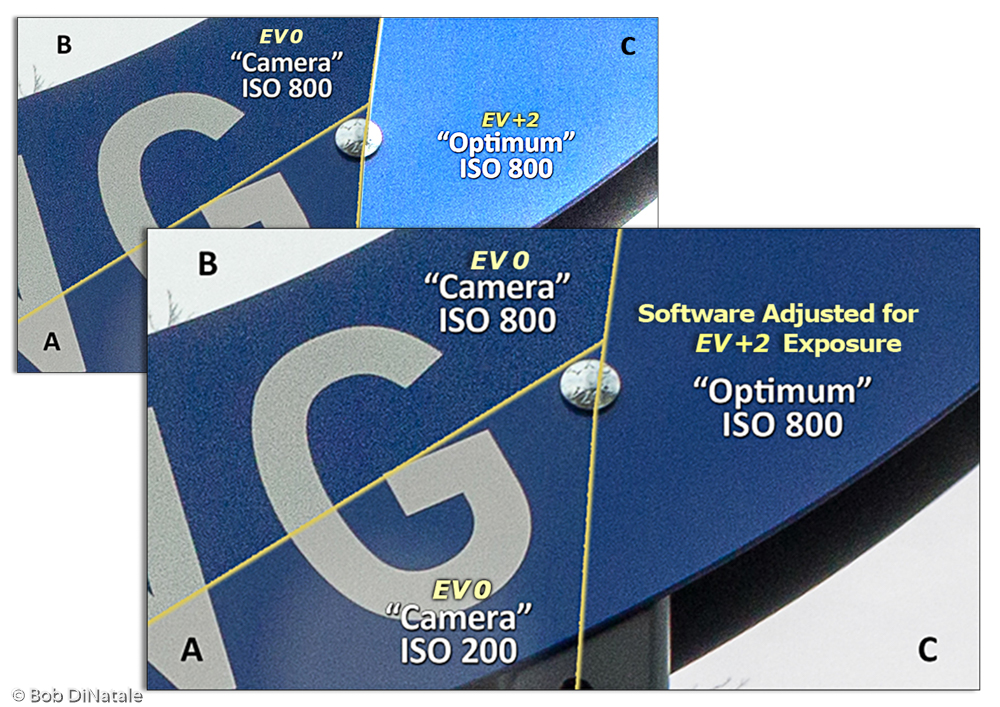 - Notice the noise from (Section C), the EV+2 exposure at 800 ISO, is the same or better than (Section A) the metered exposure at 200 ISO!