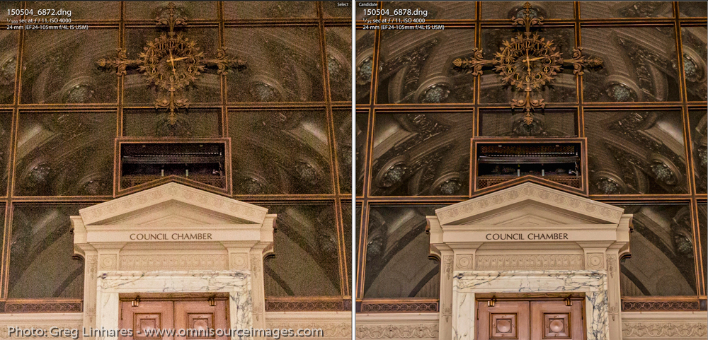 - Compare the noise from the camera’s “metered” exposure at 200 ISO (Section A) with (Section C) which was exposed at EV+2 then adjusted in the software to match the brightness of (Section A).