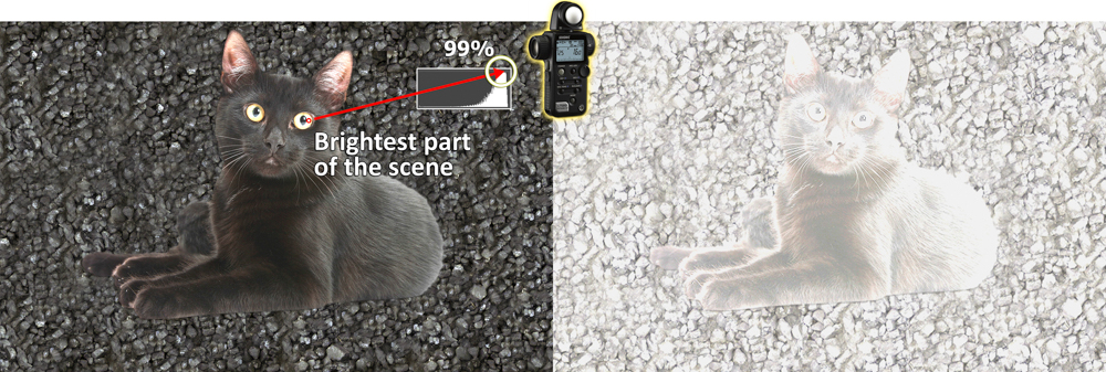 How do we produce this 99% OWP for an image? We know if we use our metered exposure, the black cat will be mid-tone brightness. However, if we spot-meter the brightest part of the scene – in the case of the black cat, the yellow green of his eye then, “place” that exposure at 99% brightness on the software’s histogram… we would obtain the optimum exposure for that scene.