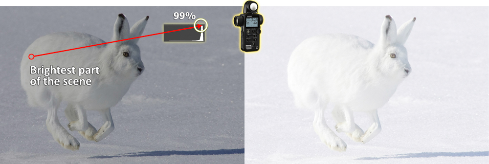 Similarly, if we meter the brightest part of the white rabbit – his hind leg, then “place” that exposure at 99% brightness on the software’s histogram… we would obtain the optimum exposure for that scene.