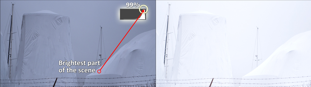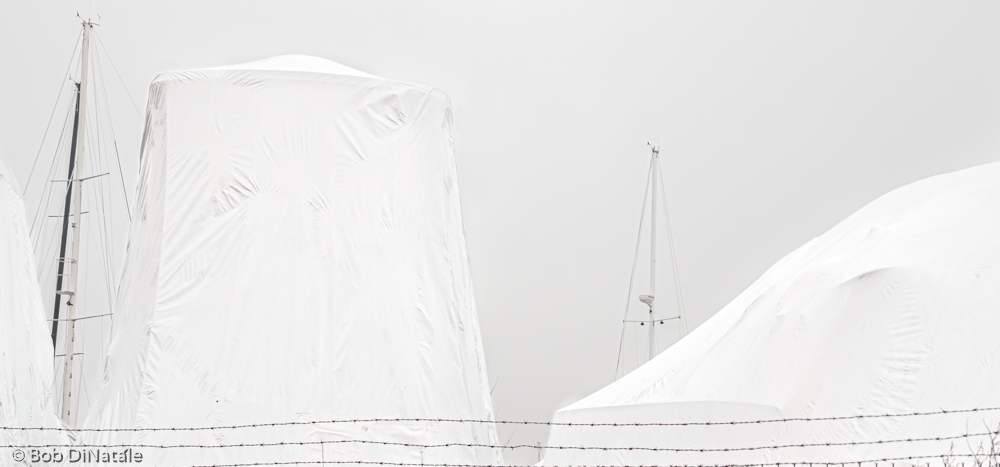 The image below was shot in a boatyard on an overcast winter day. The boats were covered with white plastic. I spot-metered the brightest part of the plastic covering and then applied my exposure bias to the digital capture. This placed the brightest part of the scene at 99.7% brightness in the software OWP.