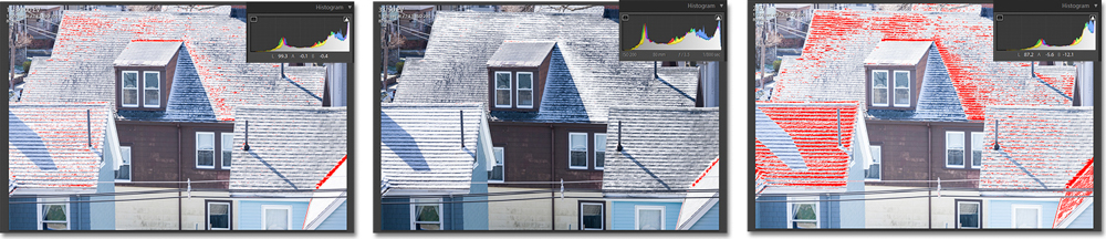In the example of the ice-coated roofs below, the exposure that shows no red clipping in highlight detail areas is the 2nd exposure. However the “most-optimum” exposure of the set is the 1st exposure EV+1.3.