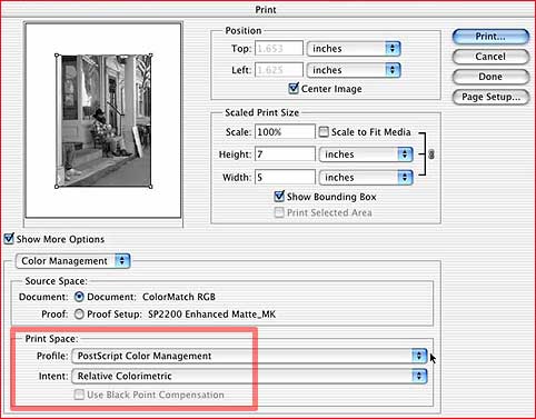 6.Next selectFile>Print with Preview, as shown below. CheckShow More Optionsand then selectColor Managementfrom the popup menu.Document Source Spaceshould be your RGB working space. For profile selectPostscript Color Management(Printer Color Managementon the PC) and for intent selectRelative Colorimetric. By default, use black point is unchecked.