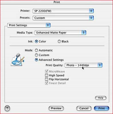 9.SelectPrint Settingsfrom the 3rd popup menu,Enhanced Matte PaperforMedia Type, check color, and for mode checkAdvancedand select either 1440 or 2880 for print quality.