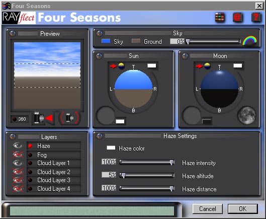 There ismuchmore here than meets the eye. On the left you can see that you can select and manipulate up to four different cloud layers as well asHazeandFogeffects. Each one of these has individually editable parameters, and likeLayersinPhotoShopcan individually be turned on or off.