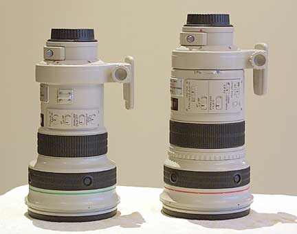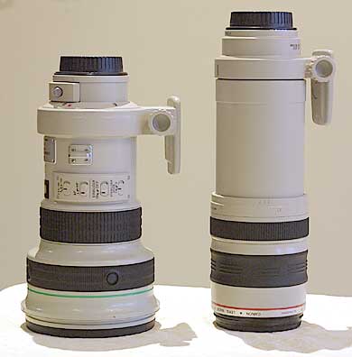 The photo above at left shows the 400mm f/4 DO next to the 300mm f/2.8L IS. Yes, thesmallerone is the 400mm. Remarkable. The frame at right above shows the 400mm f/4 DO next to the Canon 100~400mm f/5.6L IS zoom, with the zoom extended to its 400mm position.