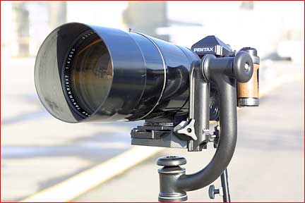 Pentax’s600mm f/4lens weighs 13lbs. It’s 14.5" long and has a front element diameter of 170mm. This is abiglens. Together with aPentax 67 IIbody the combo weighs in at nearly 17lbs. Why would anyone subject themselves to this, and how on earth does oneusesuch a lens?