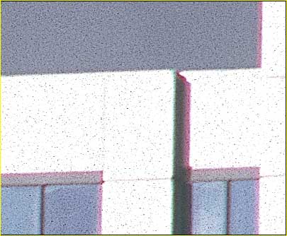 This is a stunningly sharp lens. Resolution and contrast are very good starting at f/5.6, and excellent by f/8, though wide open at f/4 it is soft. Unfortunately there’s a fly in the ointment‚longitudinal chromatic aberration. This can be seen in the 100% close-up at right above as the reddish fringe on high-contrast vertical white lines. It’s pretty bad at f/4, and a bit better at f/8, but never really goes away. At f11 and beyond it is still slightly visible, though it would take a 3 foot by 4 foot print to be of concern.