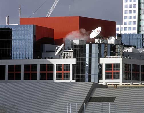 This frame is from a 100% enlargement taken with the Pentax 1.4X extender. The print at this size would be 3 feet across. Remarkable performance.(This is the horn of the satellite dish at center fame above).