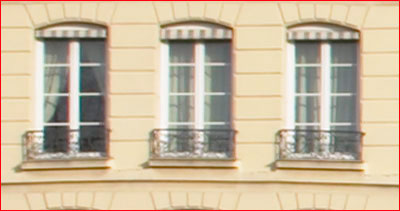 Houses along the Seine cropped — actual pixels. This crop shows the second row of windows on the second building on the left.
