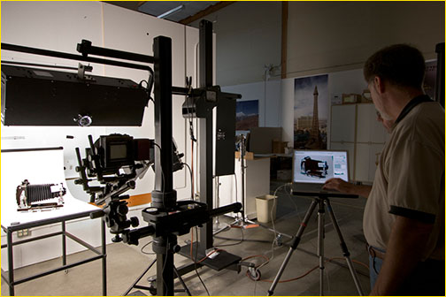 That said, here’s what we did. I had discovered in my initial conversation with Mike Collette that he was a proud owner of an Ebony SV45U2 view camera. I’m also an Ebony user and a professional spokesperson for the company in the U. S. Since we had Ebony cameras in common, I invited Ian Wilson, the import agent for Ebony and (conveniently) a San Francisco resident, to join me for the day. Once we decided to shoot something in the studio, Ian immediately suggested that we photograph Mike’s camera. I felt it would be a good subject for a test of this type—the camera and lens had intricately detailed markings, extreme values from the black bellows to the bright titanium components, and very subtle color and grain in the Ebony wood. Having chosen a subject, we then proceeded to set up a typical product photograph. The lights were continuous source HID (for obvious reasons strobes don’t work with scanning backs). The taking camera was a Cambo Legend with a 180 Apo-Symmar f5.6 lens. This set-up was tethered to my G4 Powerbook. At Mike’s suggestion we shot with Better Light’s Super 6K-HS back. As previously indicated, this is Better Light’s most popular scanning back. Its popularity derives from its balance between reasonably high resolution and reasonably short scan times. The higher the resolution of the scan back, the longer the scan time. The Super 6K-HS has a native resolution of 6000 x 8000 pixels and retails for $14,995.