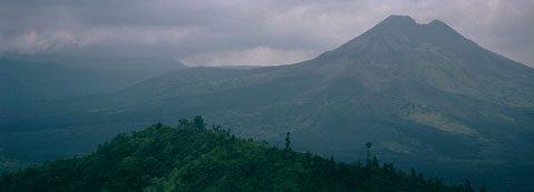 Because February is still the rainy season in Bali we spent much of the time touring the island with conditions of heavy to broken overcast. During a break in the weather one morning we stopped for a cold drink at a road-side café near the town ofPenelokan. The view from our cliff-side table was magnificent andMt. Batur, a recently active volcano, peaked through the clouds for a while.