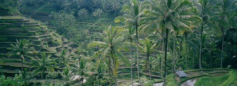 Even the mountainous interior of Bali is heavily cultivated. Here, near the town ofSebatuis an example of the beautiful yet difficult to harvest rice terraces found on the island.