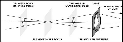 A triangular stop behind the lens results in a triangular cross-section beam of light focused on the plane of sharp focus. If the film were placed in front of the focus, an upwards pointing triangular image is produced while behind the focus, the image of the lens opening is upside down. (Remember, the photographic image itself will be upside down.)