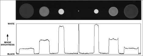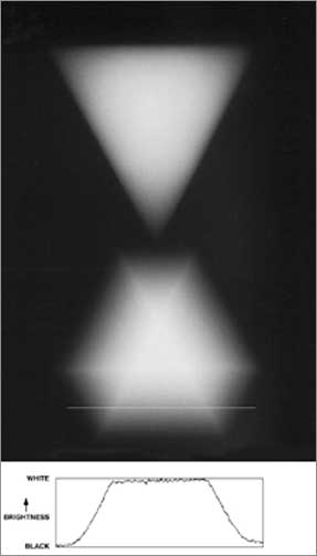 I tried photographing a test pattern (Figure 3) using openings of various shapes, and varying degrees of focus error. Figure 4 illustrates one of the results for the triangular aperture. Note especially the images of the out-of-focus triangles at the upper right of the figure. The triangle that happened to be oriented the same as the ‘triangle of confusion’ is rendered as sharp, if not evenly illuminated! The triangle oriented the other way around is more interesting. Here we see a six-sided figure with three bright lines through it. Now the really interesting part of this is that the three bright lines do not exist! They are a visual illusion! A densitometer trace (see Figure 5) through the six-sided image shows that the lines are actually just ‘corners’ where the brightness simply levels off at a value that is maintained across to the other side of the object.