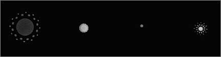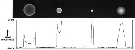 Here is a sequence of images of a pin hole illustrating the circle of confusion at four distances behind the Rodenstock Imagon. From left to right, the images were obtained 4 cm in front of the plane of best focus, 2 cm in front, at the plane of best focus and 2 cm behind it. Below the images is a graph showing the brightness of the image along a straight line through the centers of the circles.