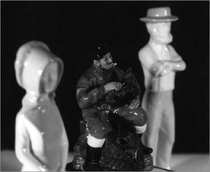 To close this discussion, I offer two last photographs. They are of the same three china figures seen in Figure 2. The 180/5.6 Nikkor-W was used to produce Figure 10, while the 250 Imagon was used to take Figure 11. The overall soft image of the lobster fisherman is evident in Figure 11, but the highlights on the woman in the foreground display a very definite bright ring effect and are quite annoying. By way of contrast, the Nikkor elicited very soft highlights in the foreground and a very sharp image of the lobster man. The highlights on the male figure in the background are similar in these two photographs, although close examination will reveal the slight bright ring effect of the Nikkor, and the bright core effect of the Imagon. Another effect can be seen in the highlight on the woman’s right eye. We see just half a circle in both photographs. What this means is that light from that particular highlight is quite directional, and only the bottom half of the lens was illuminated by it.