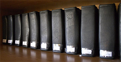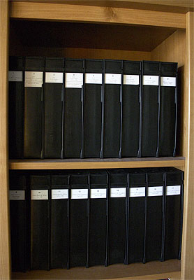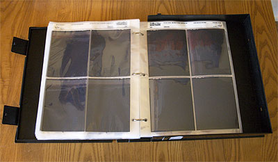 At this point I file my photographs. Developed films are stored in transparent filing pages and kept in Bestfile binders. Digital files are burned to DVD. Two copies of each DVD are made, each kept in a different physical location for maximum security.