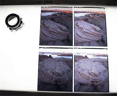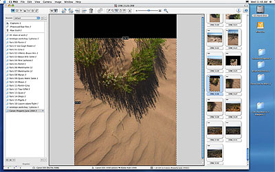 Two aspects of the selection process. On the left, 4×5 transparencies on my light table with the indispensable 8x loupe ready to be used to check for sharpness and to take a close-up look at each image. These 4×5 photographs were created at Lake Powell. On the right a Raw Conversion software interface, in this instance Phase One C1 Pro 3.5 with 35mm digital files. These 35mm images were created in Eastern Arizona. Either way the goals are the same: finding out which images are keepers.