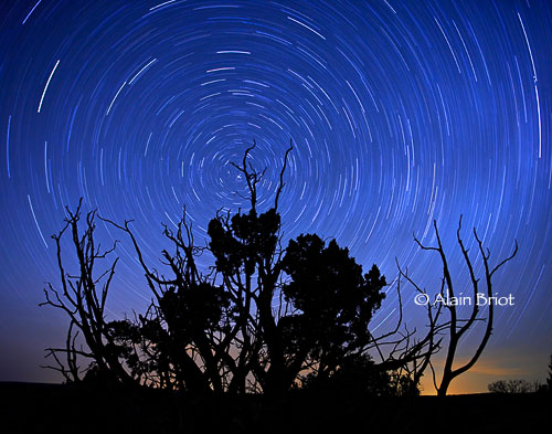 If you look at the histogram of such an image, you will see clipping in the shadows and the highlights. This is perfectly normal since the shadows are pure black and since some of the highlights –some of the star trails in this instance—are pure white. This is not a situation where we want, or can, get details everywhere. However, I was pleased to see that a lot of the star trails retained color, some reddish, others yellow, thereby providing a variation in the color and the intensity of the many star trails.