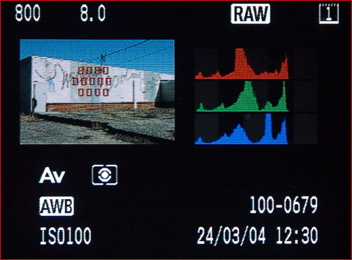 Canon’s been listening to us. The Mark II is the first Canon camera to provide a 3 colour histogram, with each channel shown as its own separate histogram next to a thumbnail of the image. It’s now possible to determine after taking a shot which channel might be blown out, and to take preventive measures. Of course a standard luminance histogram is also still available along with a flashing blown highlight warning.