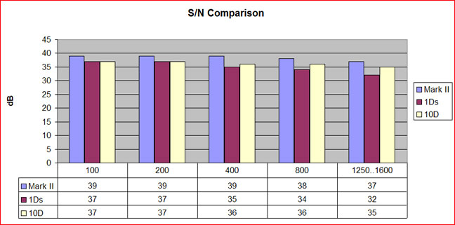 Chart 1 tells the tale. It looks as if with every generation of chip and support electronics Canon improves the signal to noise ratio a little more. In their technical literature Canon claims that the Mark II has lower noise than the 1Ds, and here we see the proof. Needless to say I was also surprised to see how well the 10D did in this regard.