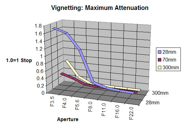 Vignetting with this lens is reasonable at both 70mm and 300mm focal lengths. At 28mm it is surprisingly high until the lens is stopped down to at least f/8. This is not a lens that I would want to use at its wide angle settings with the aperture wide open.