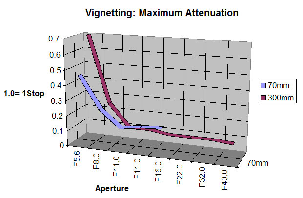 Vignetting is moderate, and not an issue except when the lens is used wide open, and even then is reasonably well controlled. Surprisingly it measures higher at 300mm wide open than at 70mm, something that is usually not the case with most zoom lenses.
