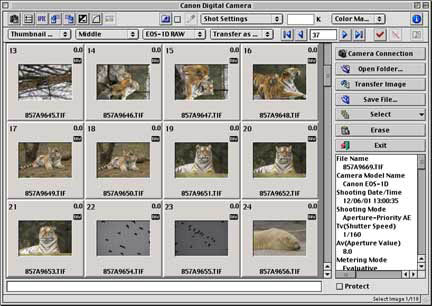 Curiously, sometimes the program appears to move and renumber files. I have experienced one instance where I loaded the card to my hard disk and went to look at the last shot that I’d taken. I couldn’t find it and figured that somehow it had been eaten. A few minutes later I found it some 15 file positions back. Very disconcerting.