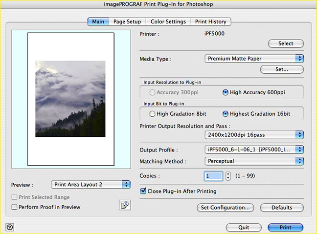 The standard printer driver is fairly straightforward, and not all that different from anything else you may already be used to. It has it’s frustrations though, which will be discussed shortly. But what sets the iPF 5000 apart is its 16 bit driver.